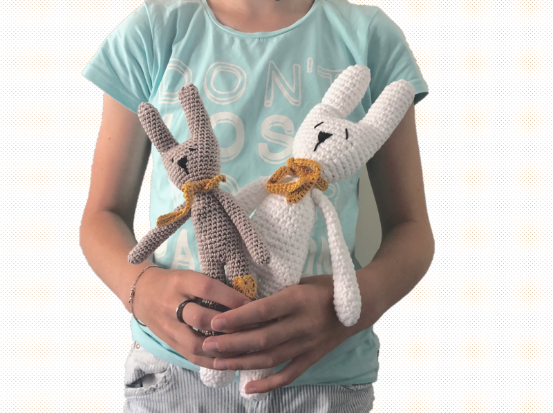 Bij metharteliefs hebben we gezocht naar lieve kadootjes die door de brievenbus passen. Zo hebben we ook een paar gehaakte knuffeltjes zoals de haasjes op bovenstaande foto, een ontwerp van Studio Mojo en het konijntje op de foto hieronder. Ze zijn er in diverse maten zodat je bijvoorbeeld een moeder/kind kan samenstellen of vriendje/vriendinnetje. Maar eentje is ook superlief.